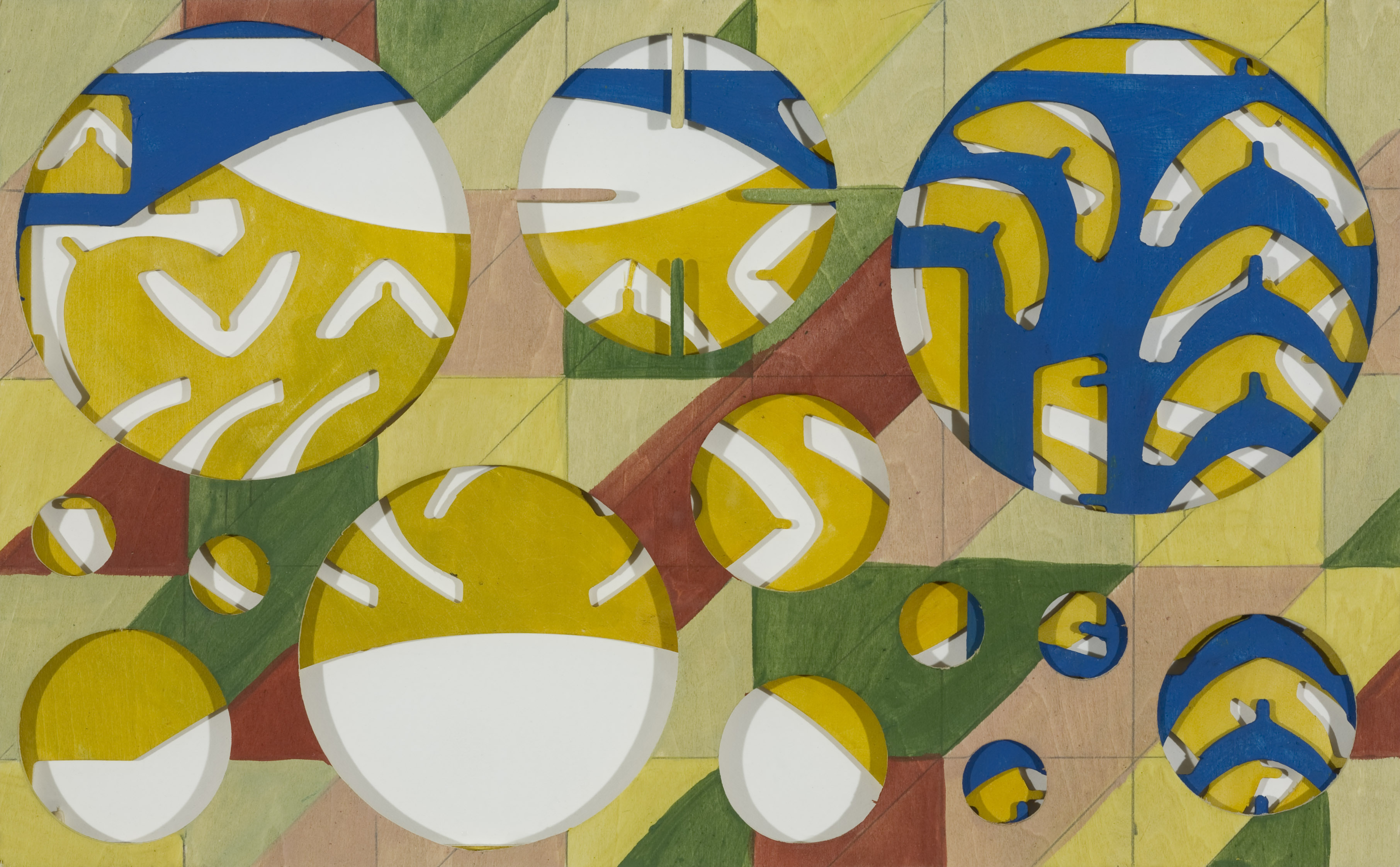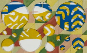 Her Puzzle pictures utilize children’s toys as solutions to problems of form and space. These works on paper use the shape of the play object as the next layer in the pattern of abstraction. Underlying layers reference, the grid, geometric abstraction, text and a found circle. The solution of these puzzle paintings is to find a point at which these various forms interplay and connect.