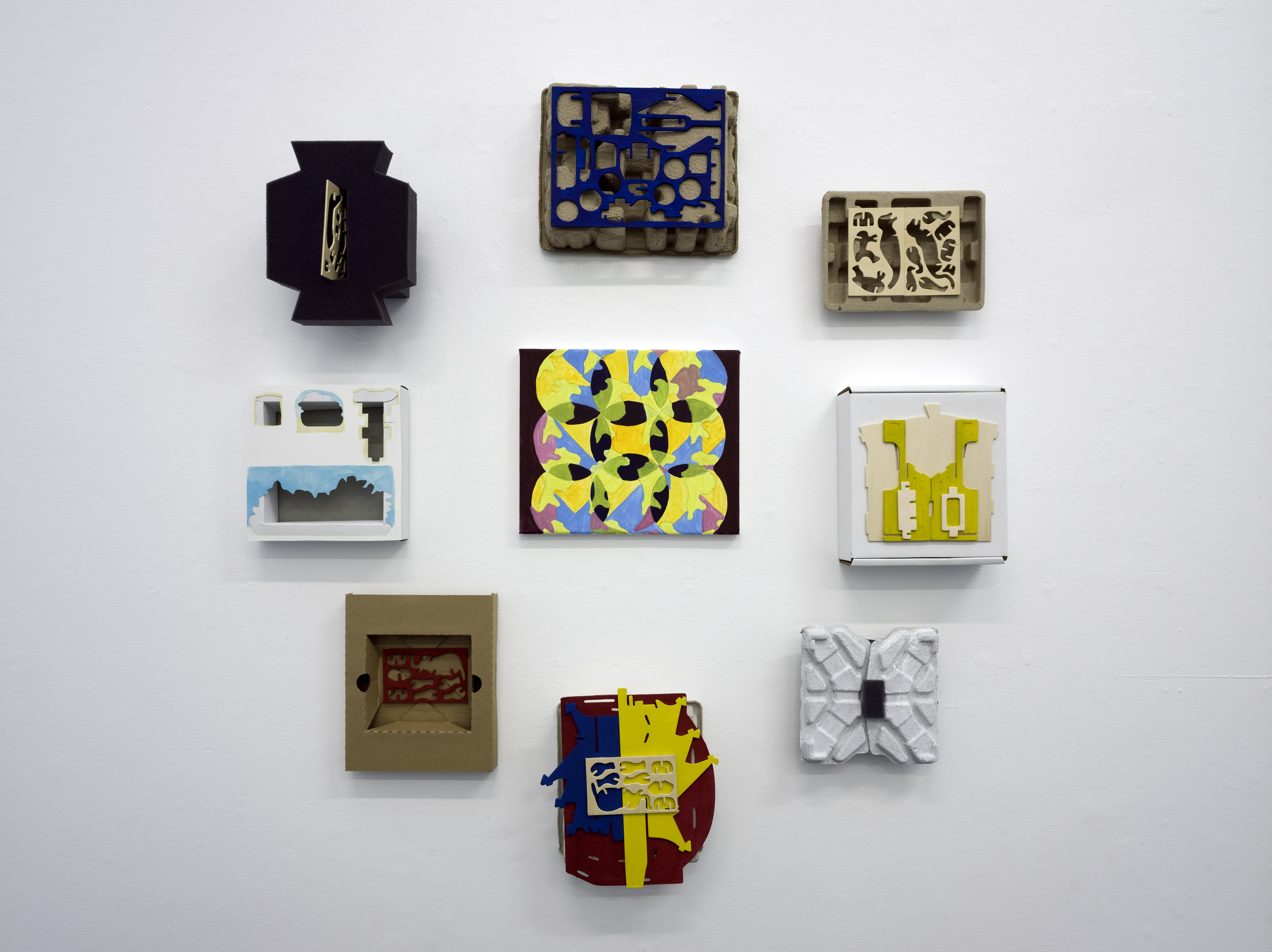 The ‘Mac Pacs’ and ‘Automated cutouts’ are a nod to the readymade. Paraphernalia is gathered from Mac Books, cardboard packaging and discarded stencils from 3D assembly toys. Lorna makes aesthetic objects out of stuff we usually throw away keeping in mind art histories such as minimalism and constructivism. In this series re-occurring ideas are played out. The packaging has become an aesthetic material used as the basis for the image. The discarded stencil is painted and becomes the layer in a relief work.